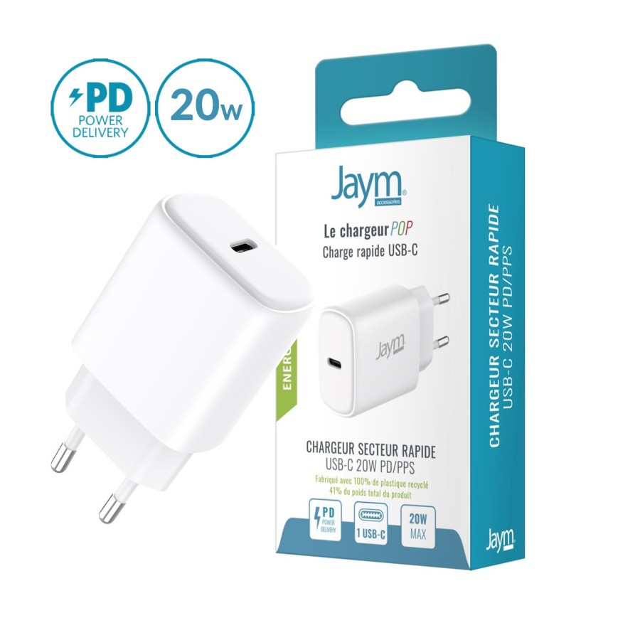Chargeur secteur USB-C Jaym® POP 20W PD & PPS – Charge rapide 50% en 30 min – Puce intelligente – Certifié CE, RoHS, REACH – Compact blanc.