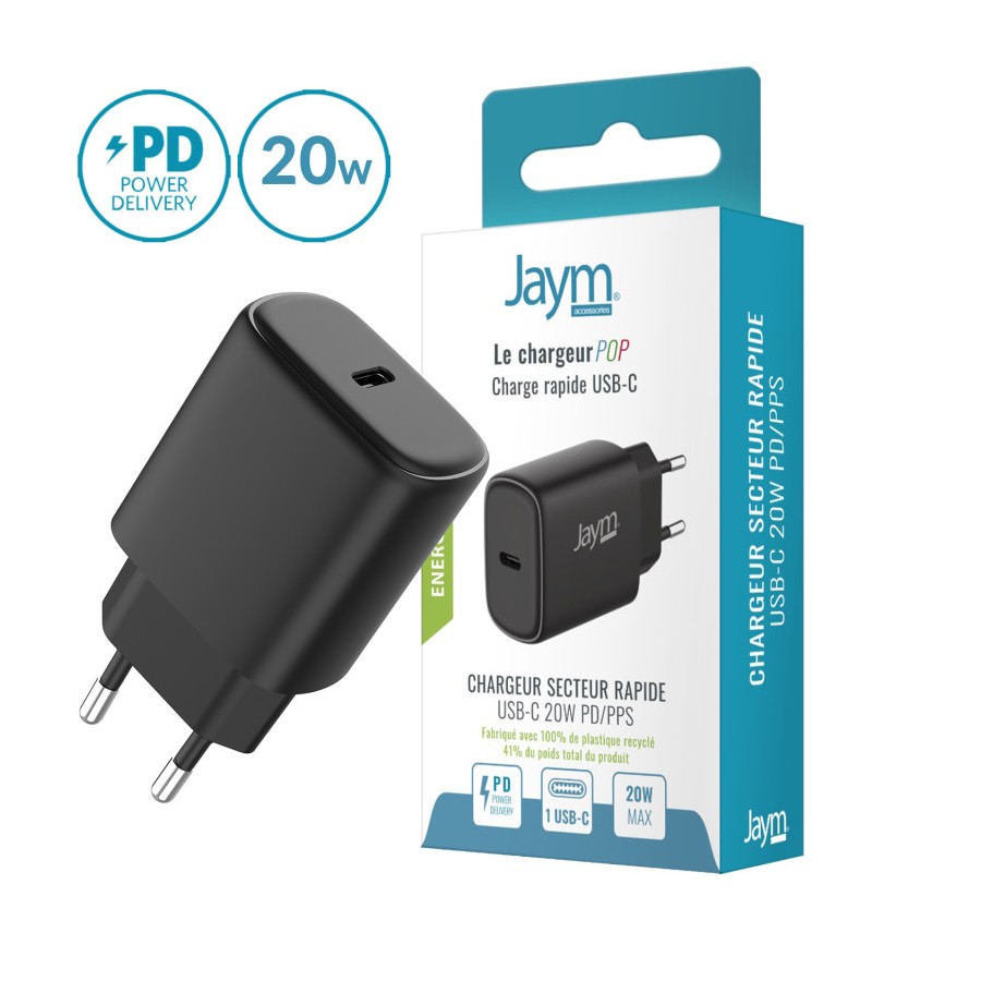 Chargeur secteur USB-C Jaym® POP 20W PD & PPS – Charge rapide 50% en 30 min – Puce intelligente – Certifié CE, RoHS, REACH – Compact noir.