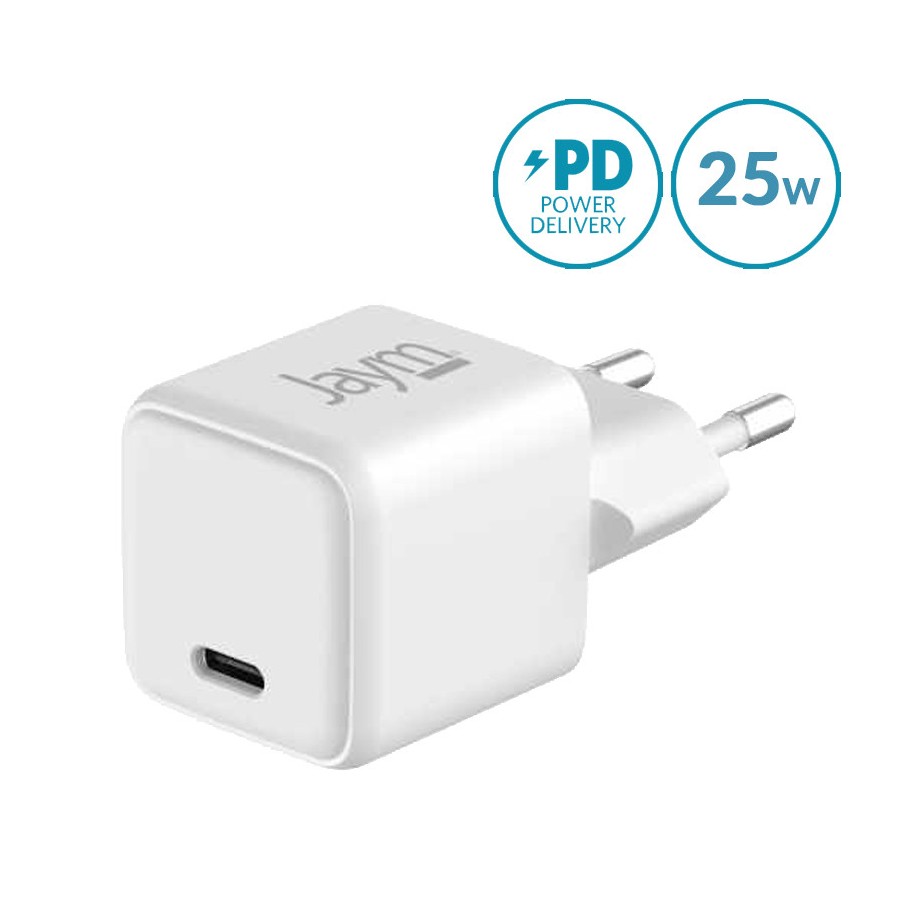 Chargeur secteur GaN USB-C 25W Jaym® – Compact, performant – Power Delivery & PPS – Plastique recyclé certifié GRS – Normes CE, RoHS, REACH – Blanc.