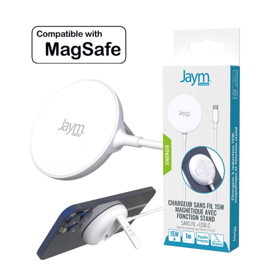 Chargeur sans fil magnétique 15W Jaym® – Compatible MagSafe – Fonction stand – Sécurité intégrée – Charge rapide – USB-C – Blanc