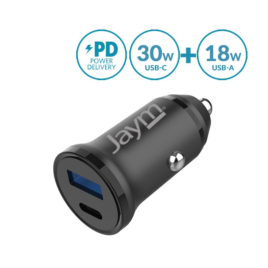 Chargeur voiture compact Jaym® – 1 USB-A QC 18W + 1 USB-C PD 30W – Charge rapide – Certifié CE/RoHS – Noir – 30W partagés max