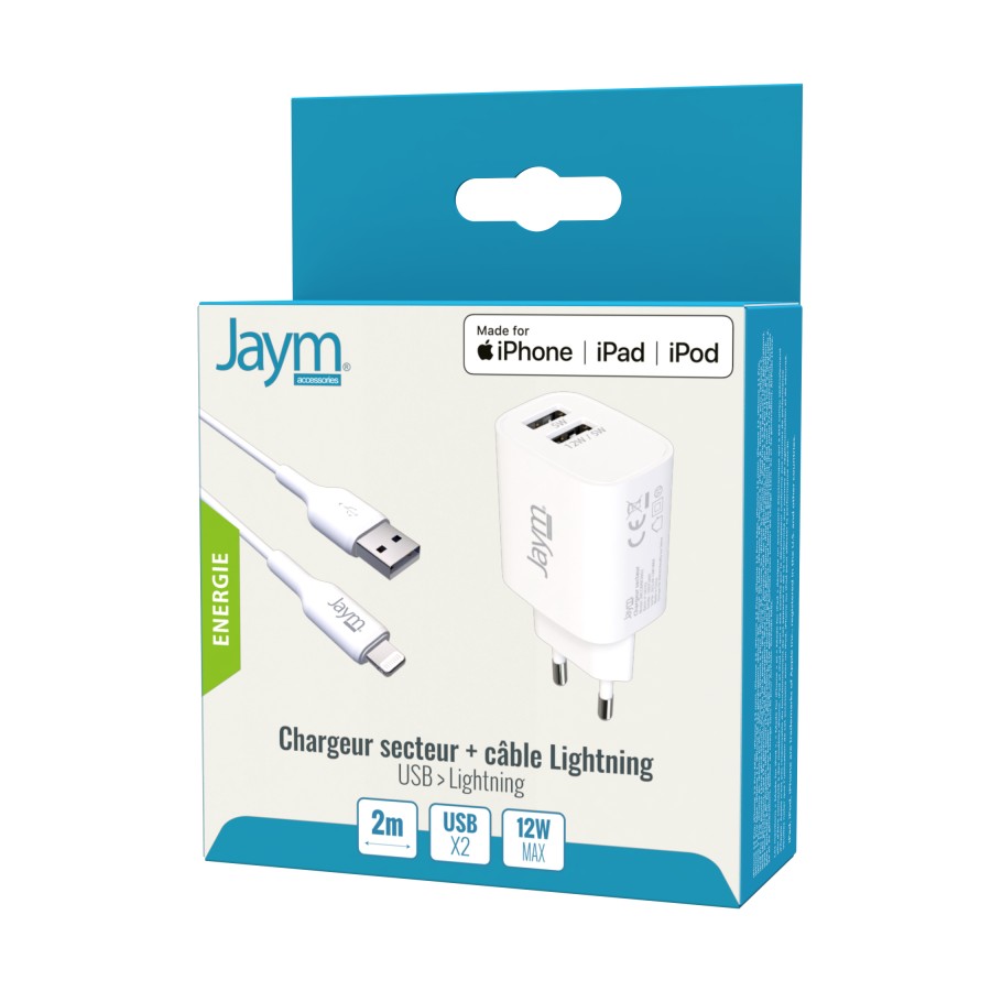 Pack chargeur secteur 2 USB-A 12W + câble USB-A vers Lightning MFI 2m – Blanc – Jaym®