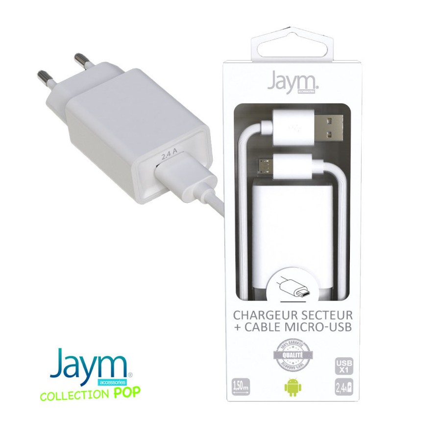 Pack chargeur secteur 1 USB 2.4A + câble USB vers Micro-USB 1,5 m – Blanc – Jaym® Collection POP
