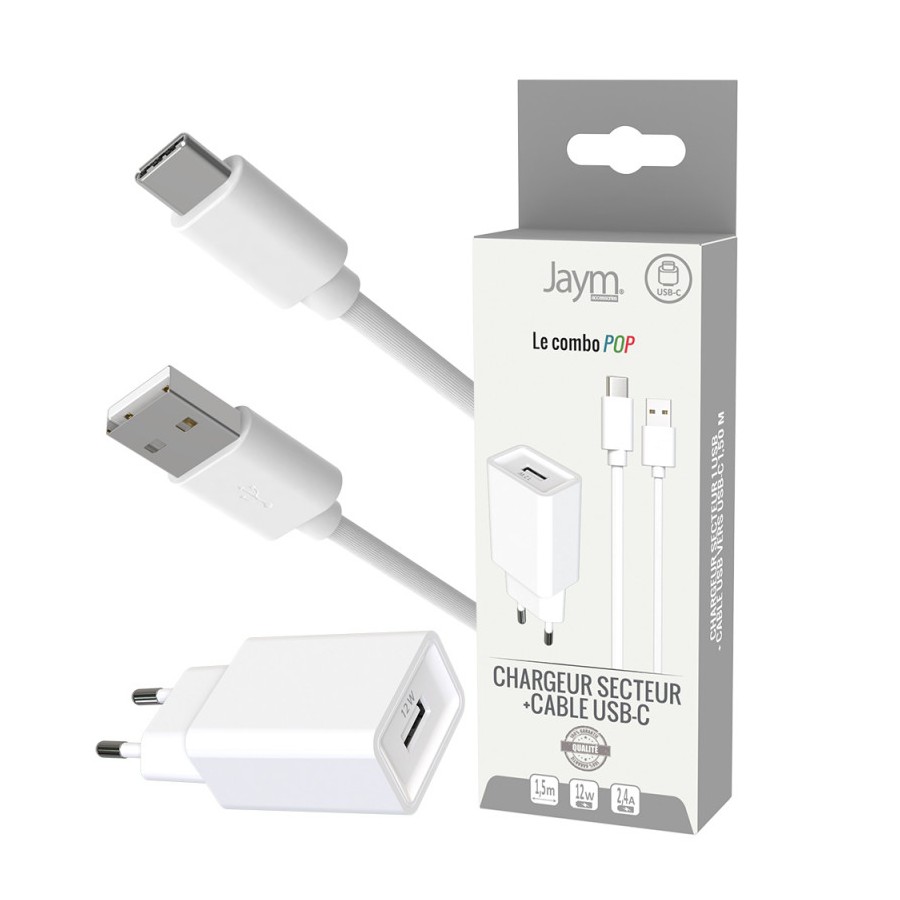 Pack chargeur secteur USB-A + câble USB-A vers USB-C 1,5 m – Blanc – Jaym® Collection POP