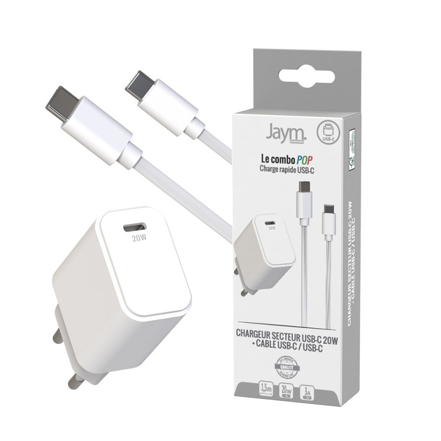 Pack chargeur secteur USB-C PD 20W + câble USB-C vers USB-C 1,5 m – Blanc – Jaym® Collection POP