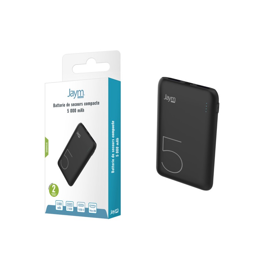 Batterie de secours 5 000 mAh – 2 USB-A OUT + 1 USB-C IN + 1 Micro-USB IN – Noire – Jaym®