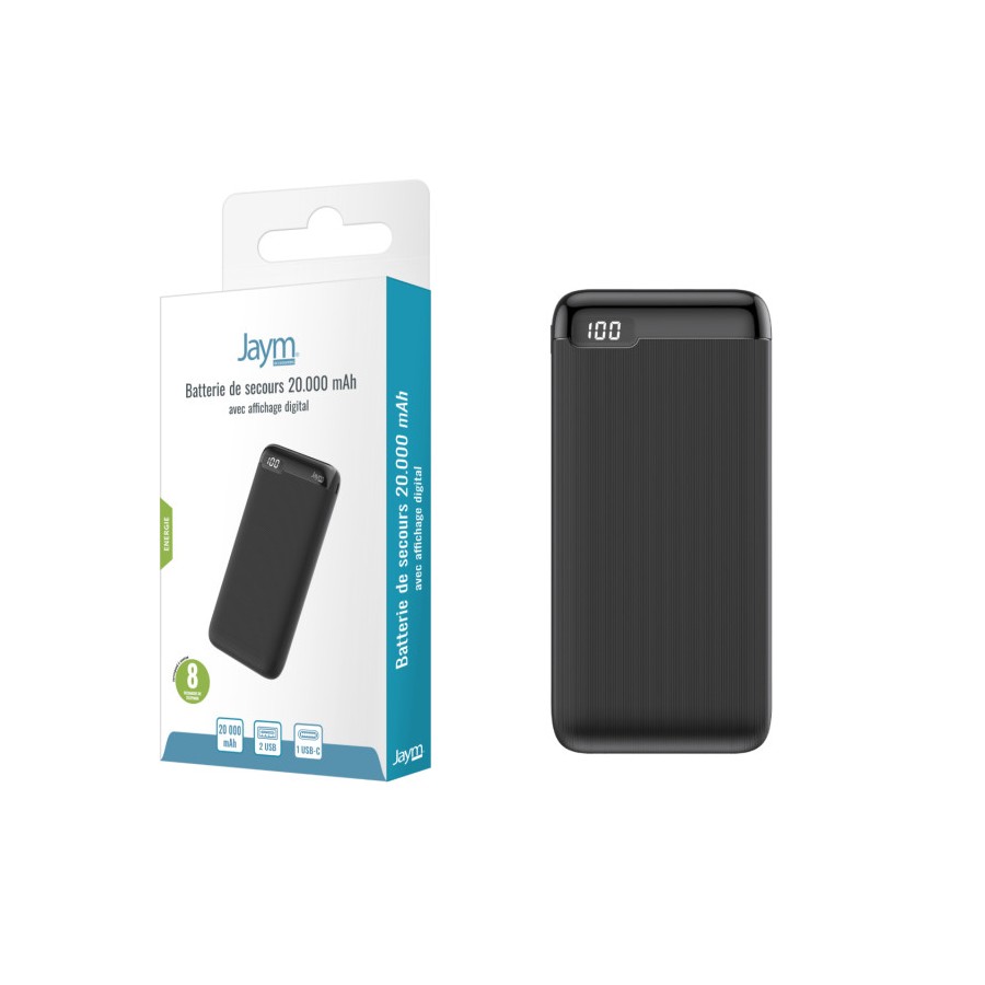 Batterie de secours Jaym 20 000 mAh noire, avec affichage digital, 2 USB-A + 1 USB-C, recharge simultanée 3 appareils, câble USB-C inclus.