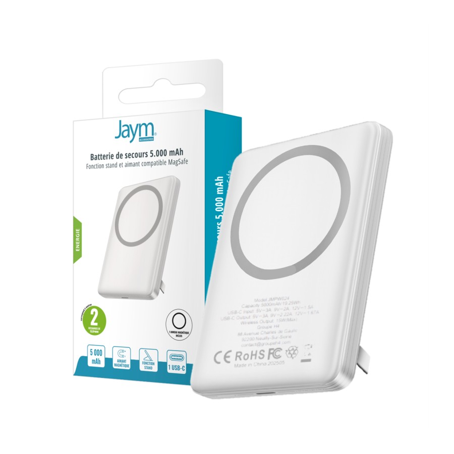 Batterie externe 5 000 mAh Jaym® blanche – MagSafe 15W – USB-C 20W – support stand intégré – ultra fine – câble et anneau inclus